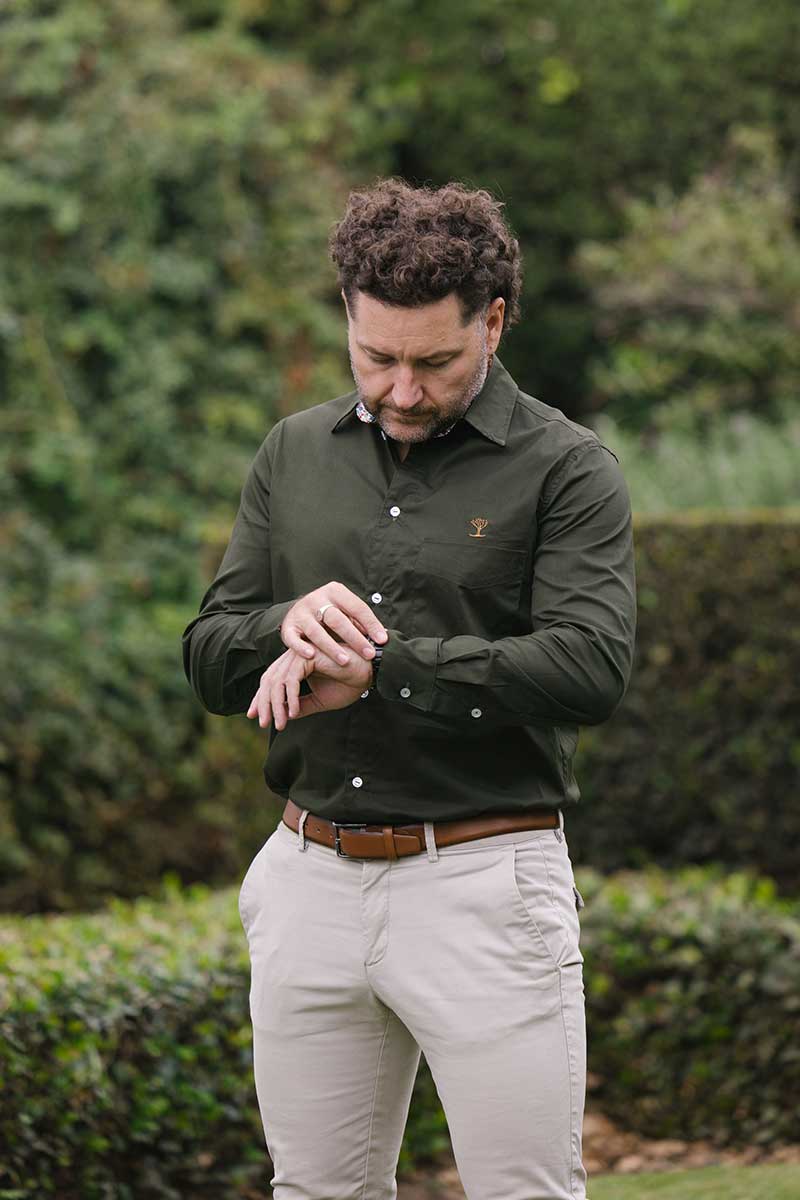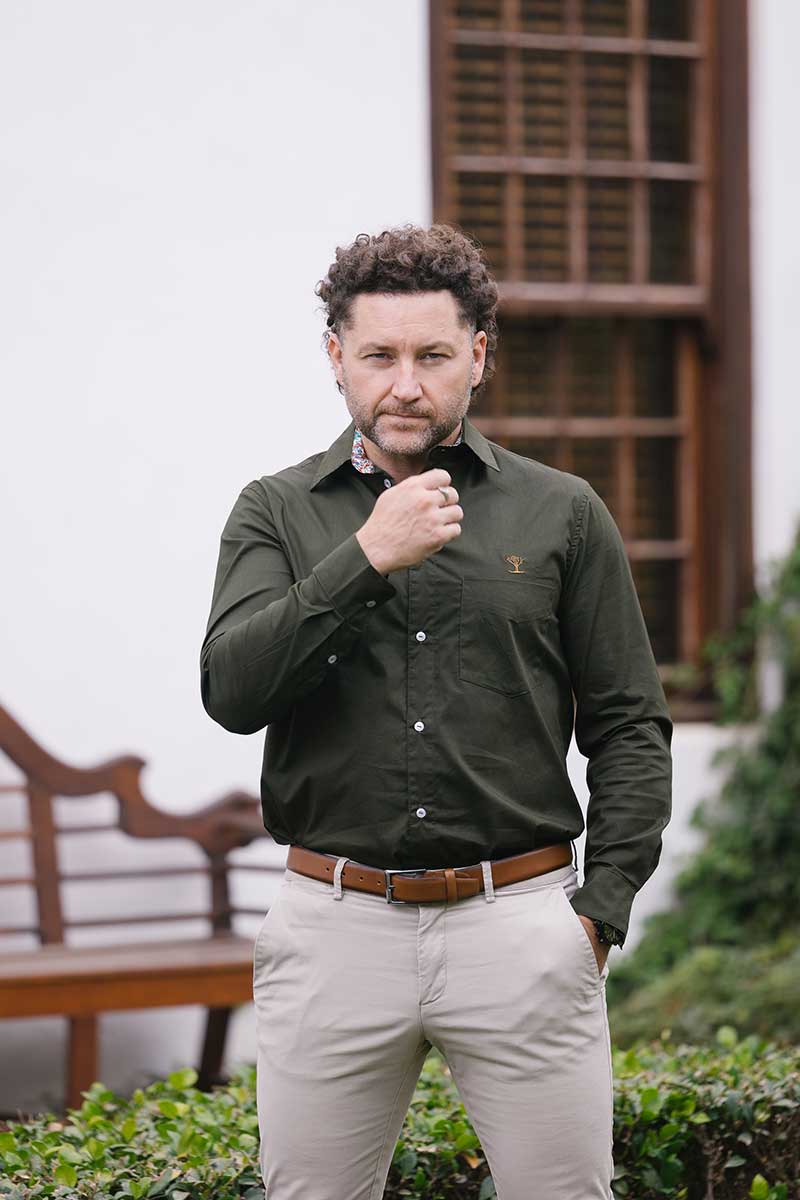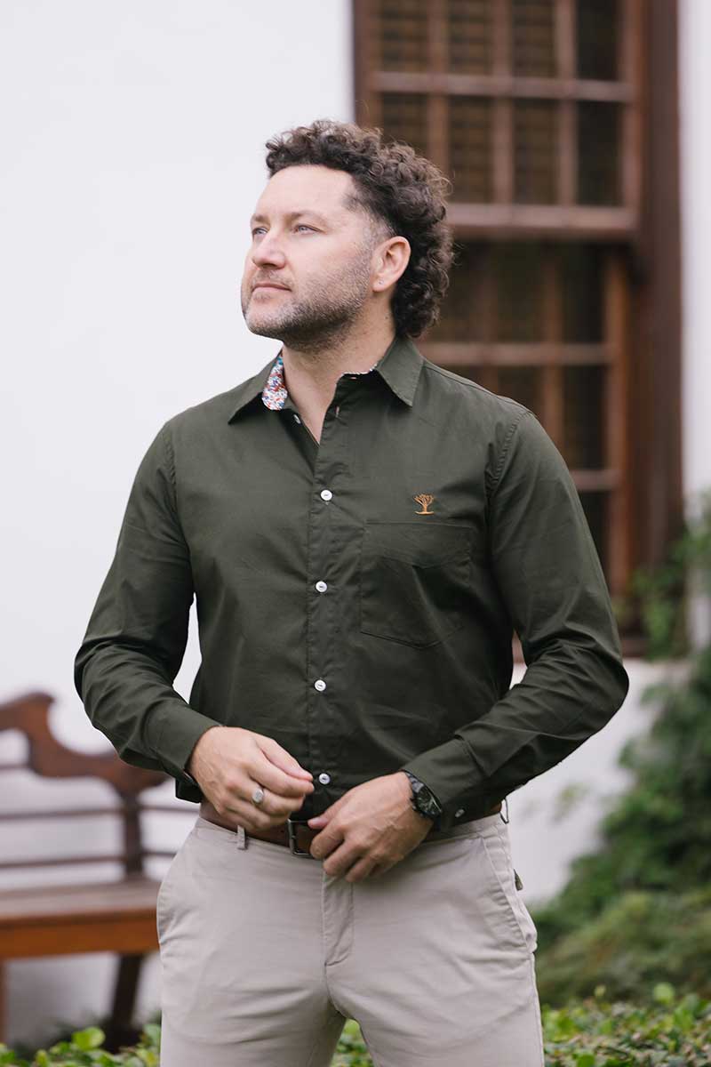 A refined wardrobe essential, this 100% cotton shirt offers the perfect balance of breathability and structure for all-day comfort. Designed in a rich dark olive, it features a classic cut with a left chest embroidered with our signature quiver tree logo. Thoughtful contrast detailing on the cuffs, inner back, and collar adds a sophisticated touch. The button-down front and traditional collar ensure versatility, making it easy to dress up or wear casually for any occasion.