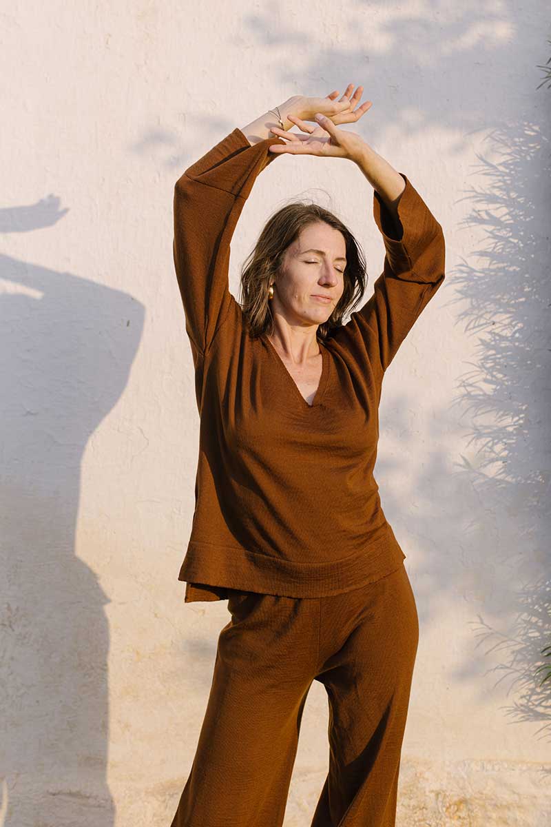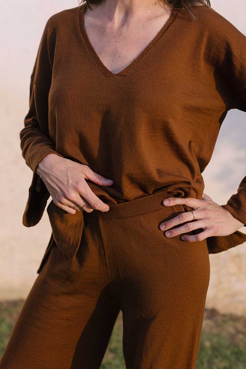 Available in two classic shades—sleek black for an understated look and rich copper brown for a warm, earthy feel—this versatile piece is designed for year-round wear. Warm enough for cooler days yet breathable for all seasons, it pairs effortlessly with our Sam Knit Trousers for a refined yet relaxed ensemble.